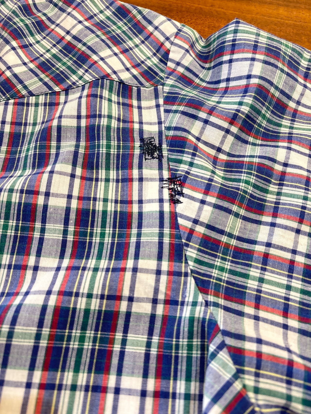 右肩裏に直しあと、表面ボタン横にピンホール有り。