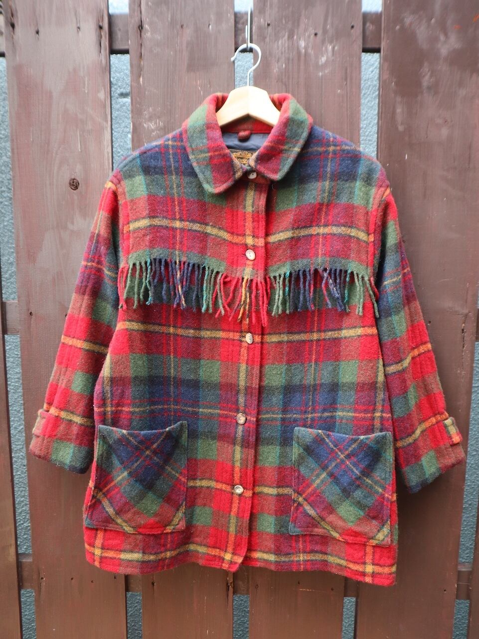 EddieBauer check pattern wool fringe jacket